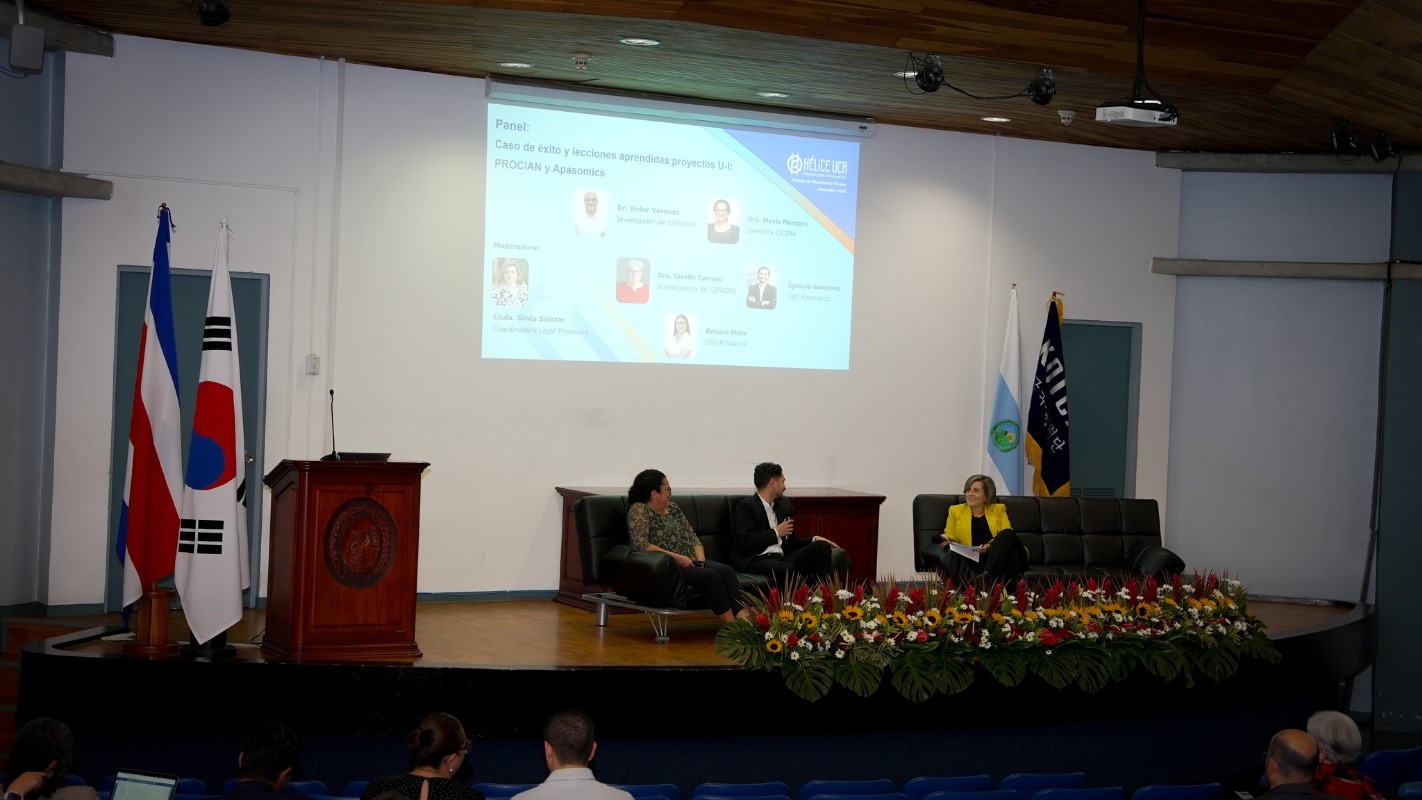 Apasomics cuenta su experiencia como empresa derivada de la investigación realizada por la UCR. El pasado 4 de noviembre, en el Auditorio de la Investigación, se realizó el primer día del evento de presentación de los resultados finales y la transferencia de experiencias del Programa Hélice-UCR. Foto: Portal de la investigación.