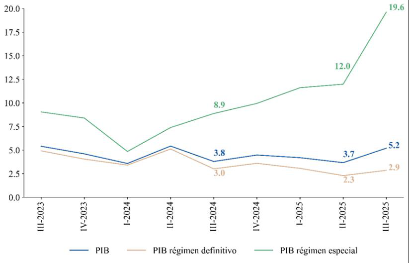 La vista trimestral revela que el régimen definitivo aportó 2,44 p.p. y el especial aportó 2,87 p.p. del crecimiento total al III trimestre del 2025.