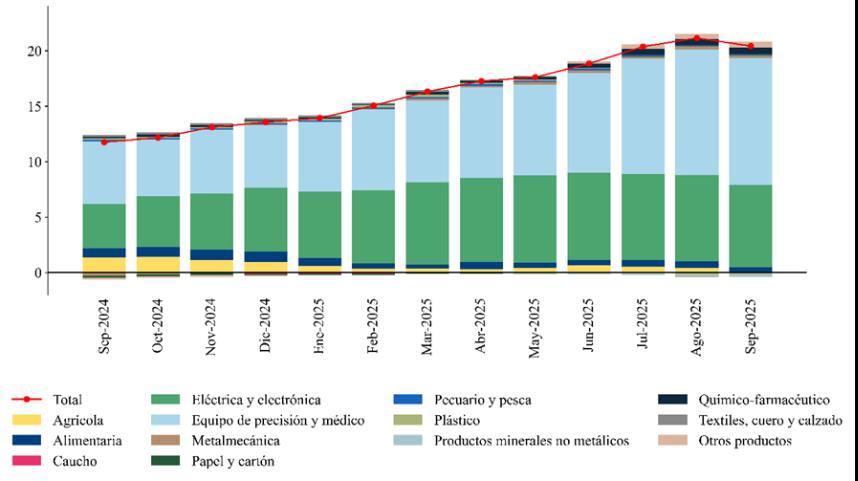 Entre setiembre de 2024 y setiembre de 2025, las exportaciones del régimen definitivo aumentaron un 2,6 %, mientras que las del régimen especial lo hicieron un 21,8 %; las exportaciones del régimen especial representaron el 70 % del total de exportaciones nacionales.