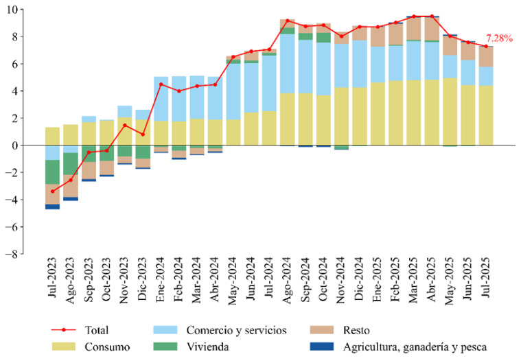 Crecimiento interanual de los saldos del crédito del sistema bancario al sector privado no financiero por actividad económica ( de julio 2023 a julio 2025)