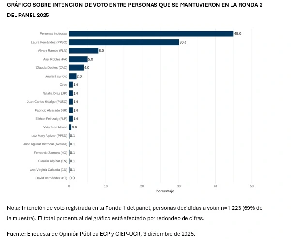 Finalmente, en cuanto a los resultados sobre la intención de voto, o sea, las personas que dieron que sí votarán, más los que están totalmente decididos a hacerlo, que suman un 69 % de las personas encuestadas: un 45 % dijeron estar indecisos sobre cuál candidatura apoyar, mientras que sólo dos de ellas están arriba del 5 %, Laura Fernández del PPSO y Álvaro Ramos del PLN.