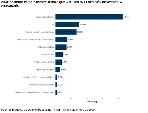 Un 42.4 % dijo que la seguridad ciudadana y es el que tiene una amplia prioridad, después vienen el empleo y el crecimiento económico con 13.3 %, la corrupción y la transparencia con 7.5 %, la educación pública con 6.9 %, el costo de vida con 4.6 %, y salud y la Caja Costarricense del Seguro Social con 4.0 %.