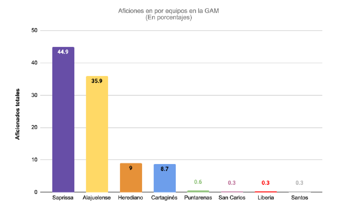 Dentro de la GAM, el Deportivo Saprissa continúa siendo el club con más seguidores, con un 36,4 % del total, seguido por la Liga Deportiva Alajuelense, con un 29,1%.