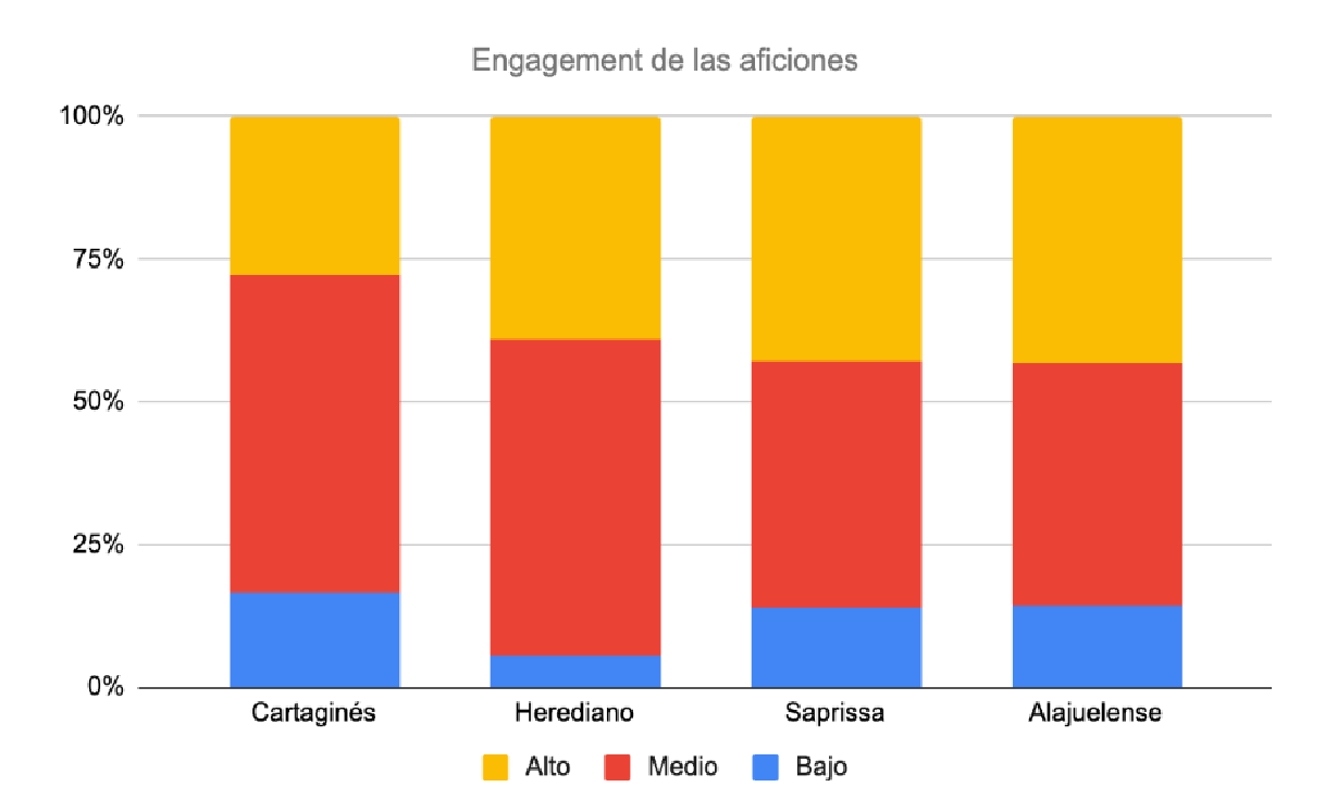 El análisis del engagement muestra que Saprissa y Alajuelense son los clubes con mayor proporción de hinchas con vínculo “alto” (alrededor del 43 % en ambos casos). Herediano y Cartaginés concentran la mayor parte de su hinchada en el nivel “medio” (55,6 % en los dos casos). Herediano registra la menor proporción en el nivel “bajo” (5,6 %), mientras que Cartaginés tiene un porcentaje mayor en ese tramo (16,7 %). Esto sugiere dos dinámicas simultáneas: por un lado, los clubes grandes mantienen una franja importante de seguidores fuertemente comprometidos; por otro, los clubes con menor masa de hinchas (como Herediano y Cartaginés) sostienen una base amplia en el compromiso medio.